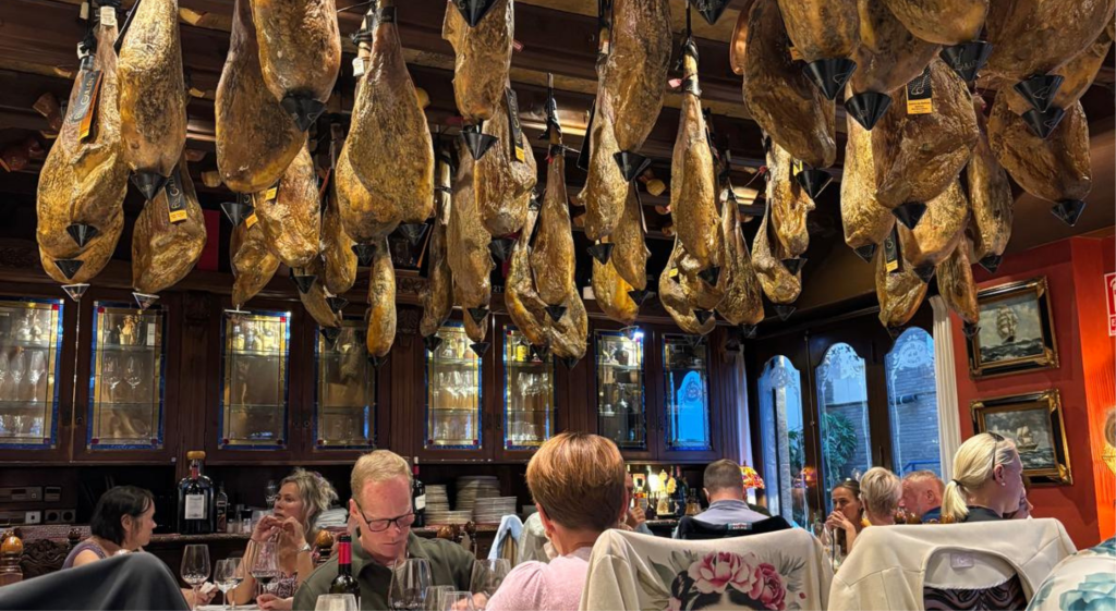 El Mesón de la Costa zit in Torrevieja en is zo’n restaurant waar je meteen voelt dat het goed zit. Zodra je binnenloopt, zie je die hammen aan het plafond hangen, wat meteen sfeer geeft. Het is een typische Spaanse plek, gezellig zonder poespas.